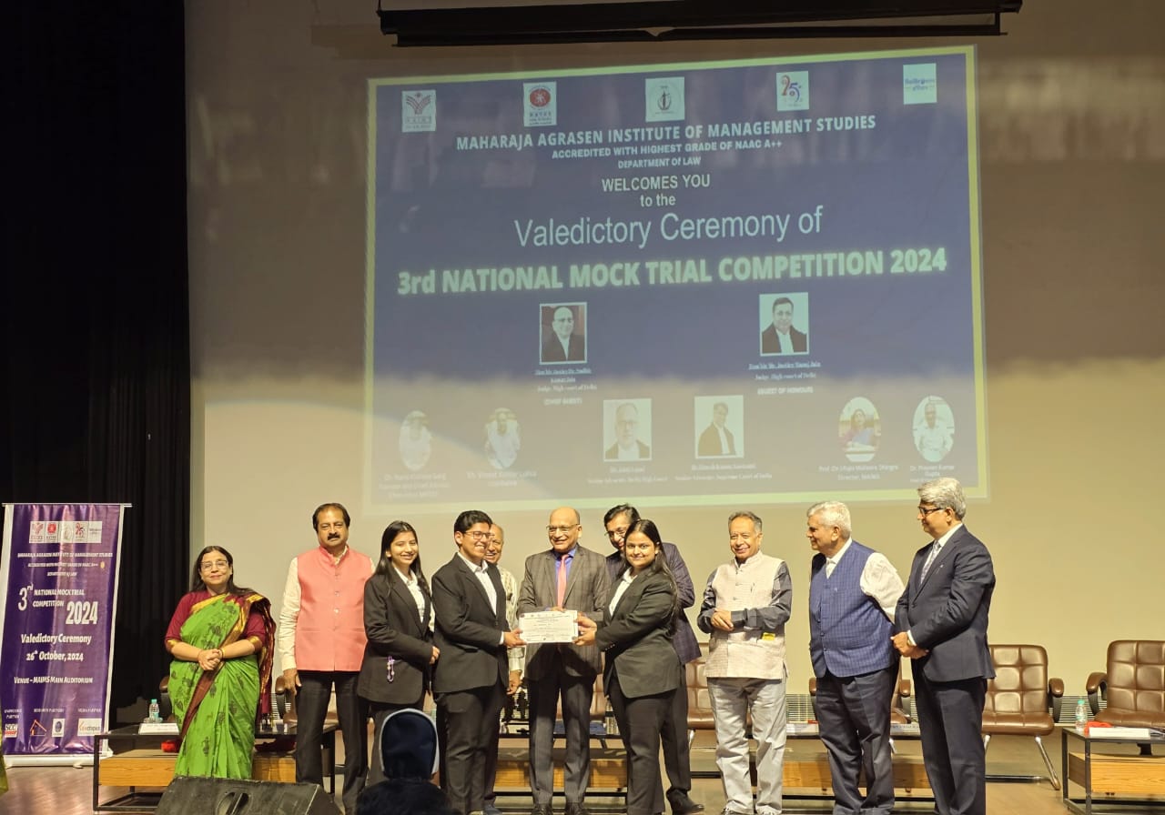 Third consecutive win this year for The Trial and Appellate Advocacy Society of KIIT School of Law. The TAAS team comprising of Aaradhya Soni, Shraddha Jha and Sridhar Chaurasia from 3rd Year represented KIIT School of Law at the 3rd National Mock Trial Competition 2024 organized by Maharaja Agrasen Institute of Management Studies, Department of Law at Delhi. After competing with 38 Teams across the nation they qualified for the Semi-Finals and secured the Title of 2nd Runners Up.