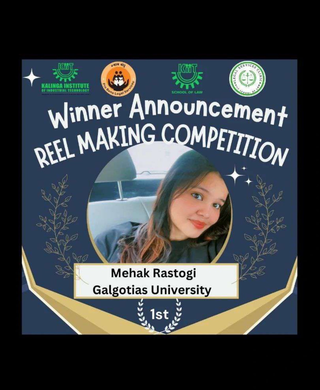 - 1st Prize: Mehak Rastogi from Galgotias University wowed the judges with her insightful and visually engaging reel that demystified complex legal principles.