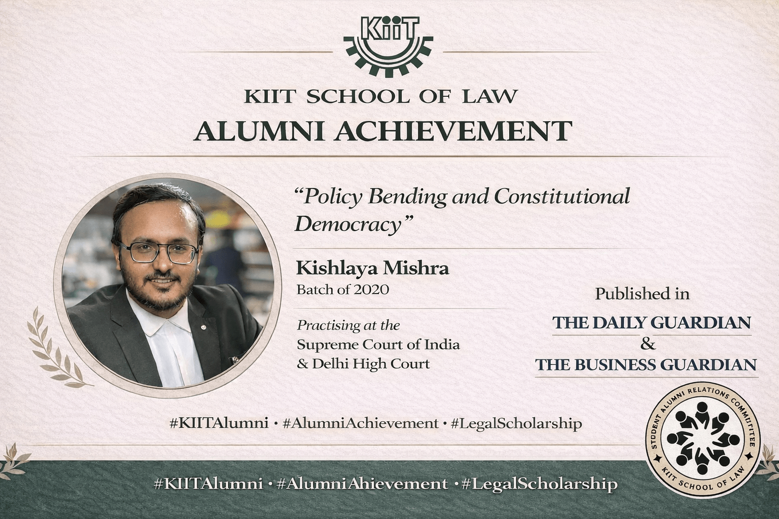 KIIT School of Law is proud to highlight the academic and professional accomplishment of its alumnus Kishlaya Mishra (Batch of 2020).