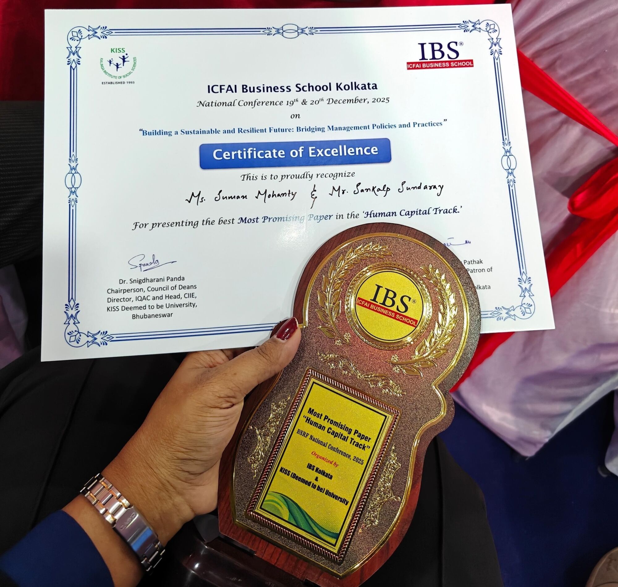 We are delighted to share that our research scholar, Ms. Suman Mohanty, along with her co-author Mr. Sankalp Sundaray, has been awarded the “Most Promising Paper” in the Human Capital Track at the National Conference 2025 organized by ICFAI Business School, Kolkata, held on 19th–20th December 2025.